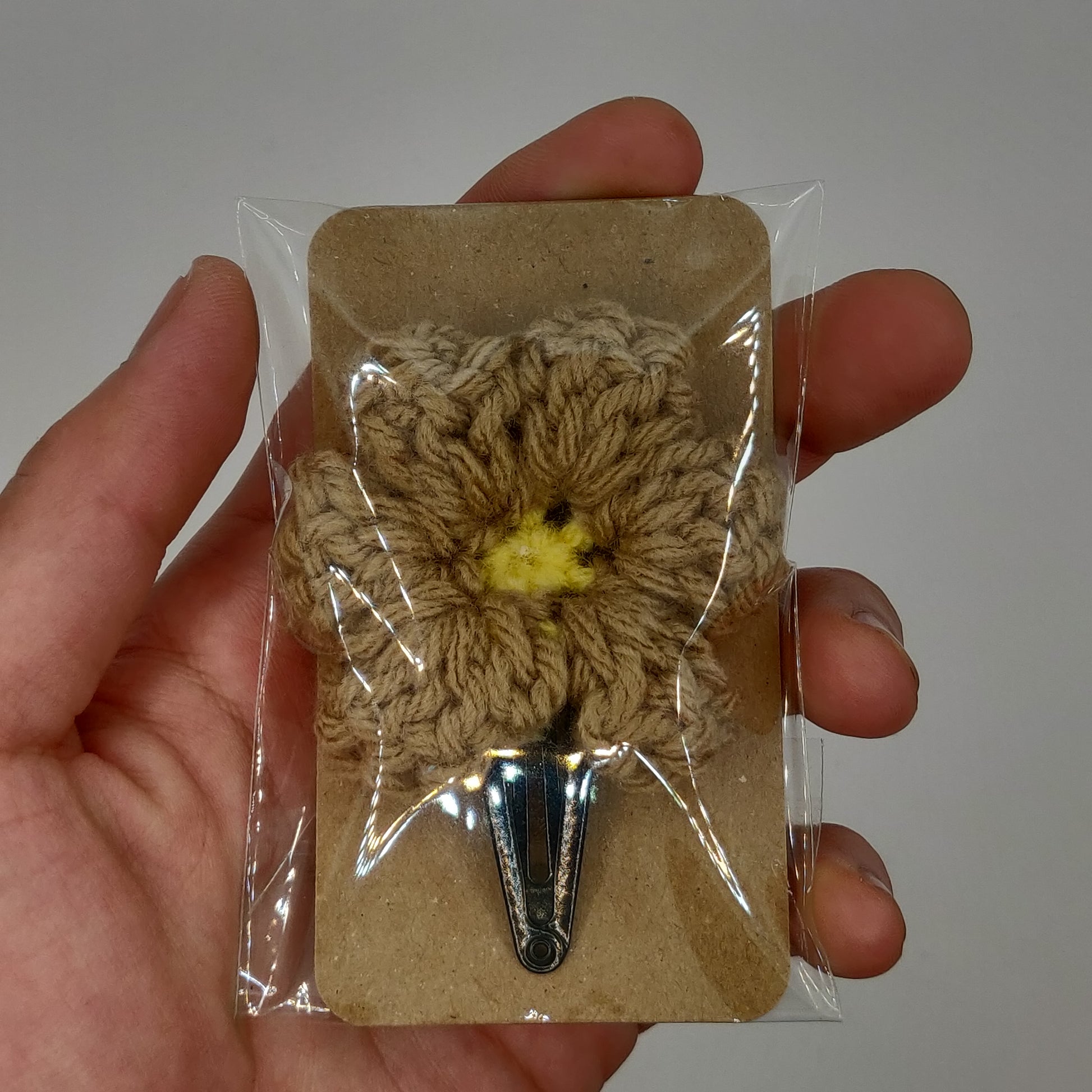 Handmade crochet flower barrettes attached to a metal snap on barrette.
