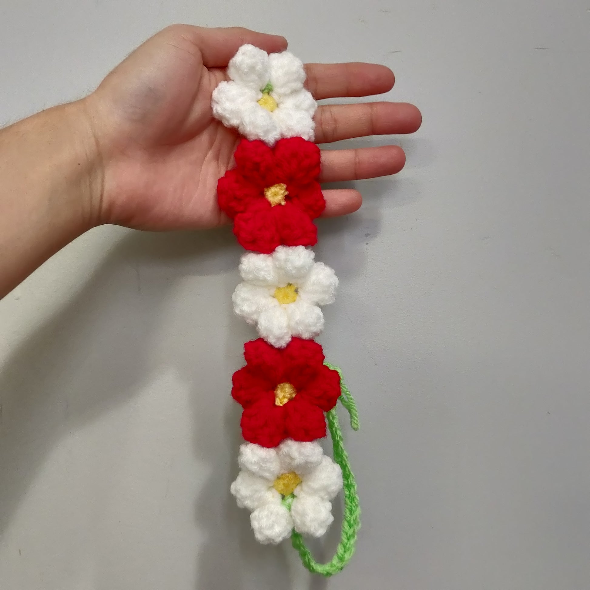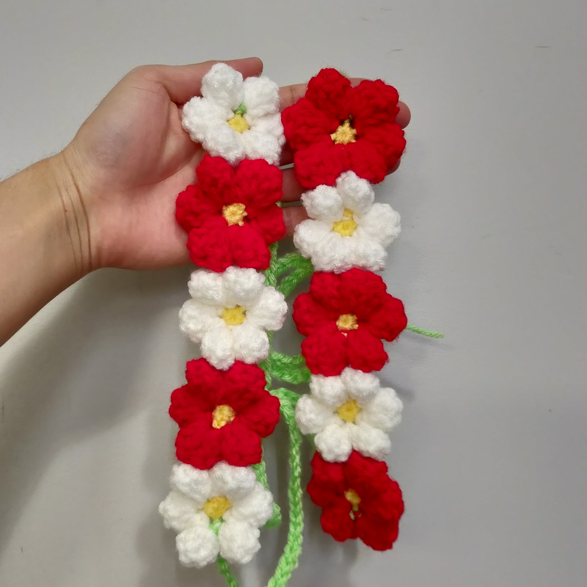 Crochet Floral Headband #32 is made with five handmade crochet flowers in Red and White.