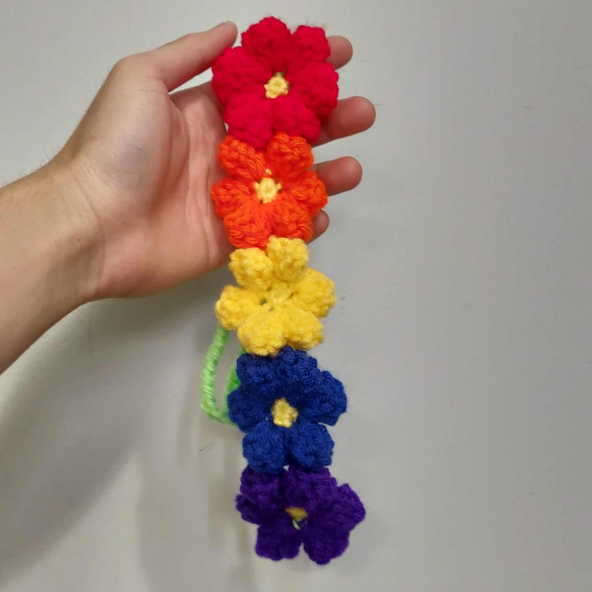Crochet Floral Headband #34 is made with five handmade crochet flowers in Red, Orange, Yellow, Blue, and Purple.
