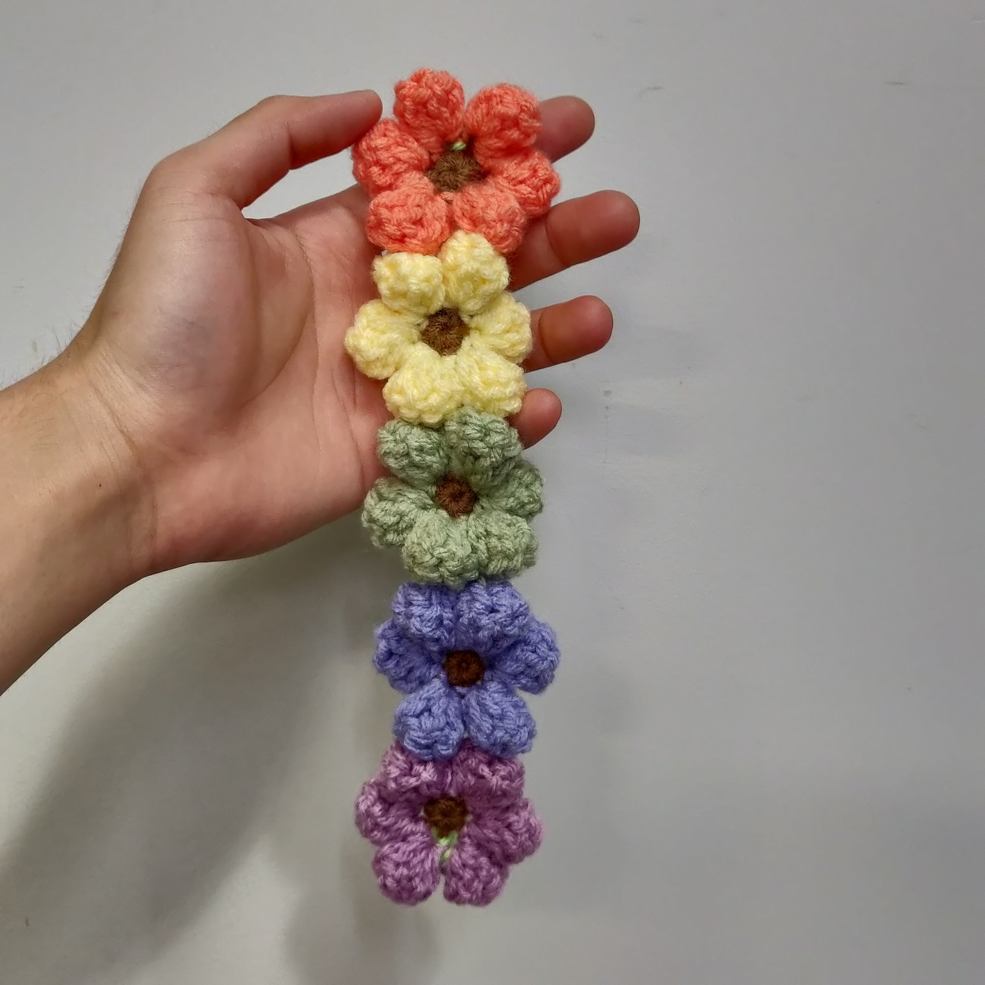 Crochet Floral Headband #41 is made with five handmade crochet flowers in Pastel Red, Pastel Yellow, Pastel Green, Pastel Blue, and Pastel Purple.