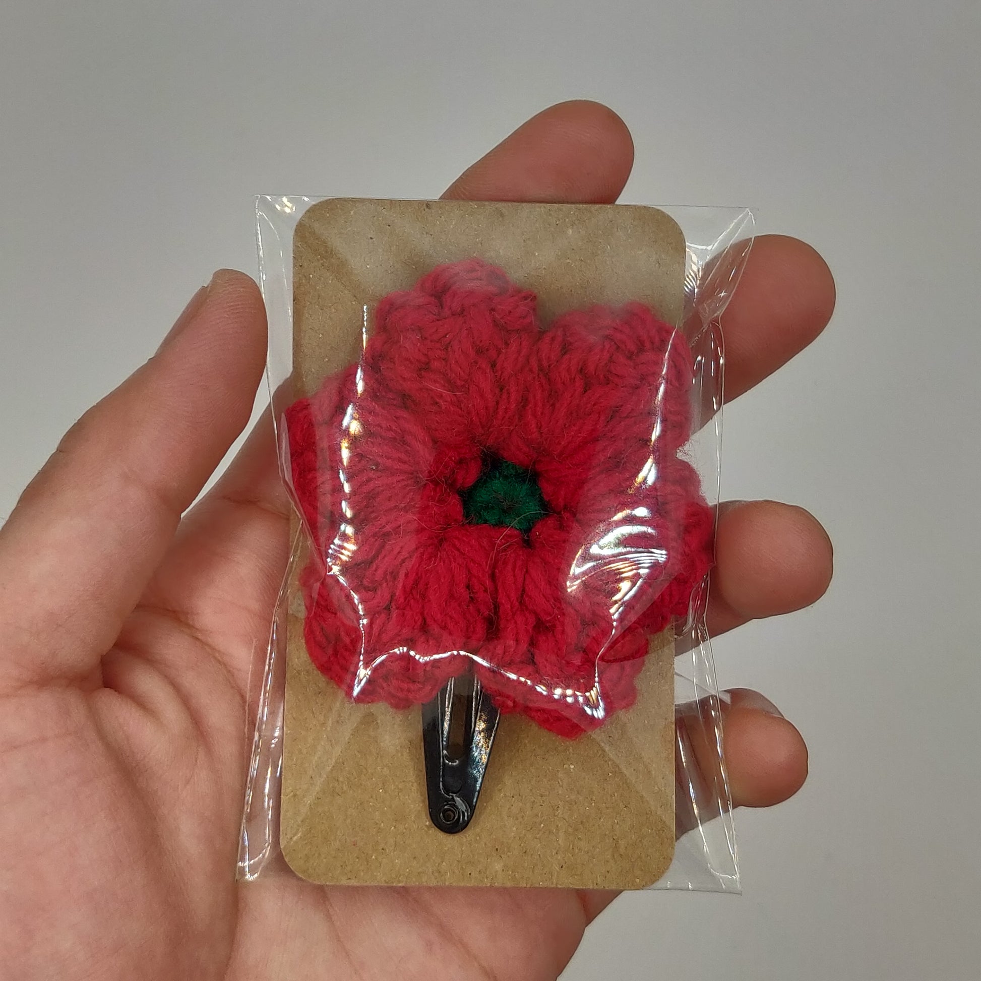 Handmade crochet flower barrettes attached to a metal snap on barrette.