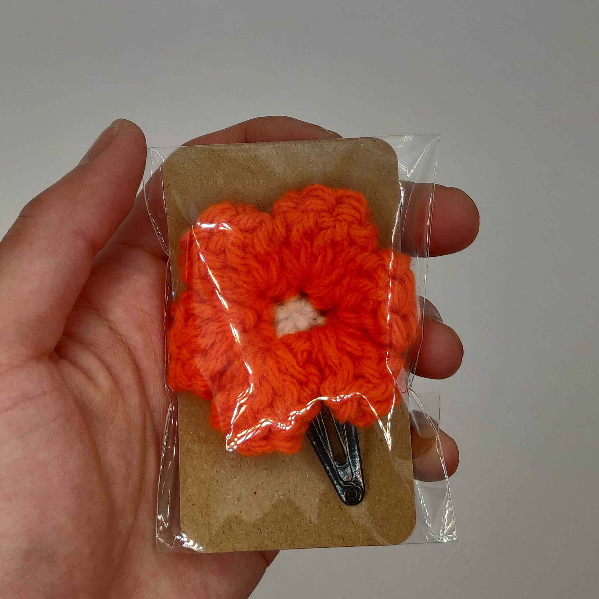 Handmade crochet flower barrettes attached to a metal snap on barrette.
