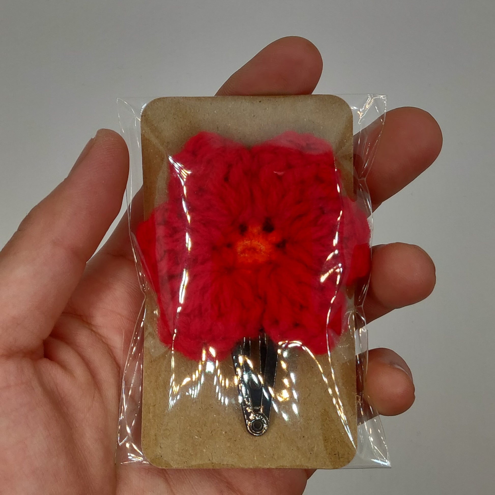Handmade crochet flower barrettes attached to a metal snap on barrette.
