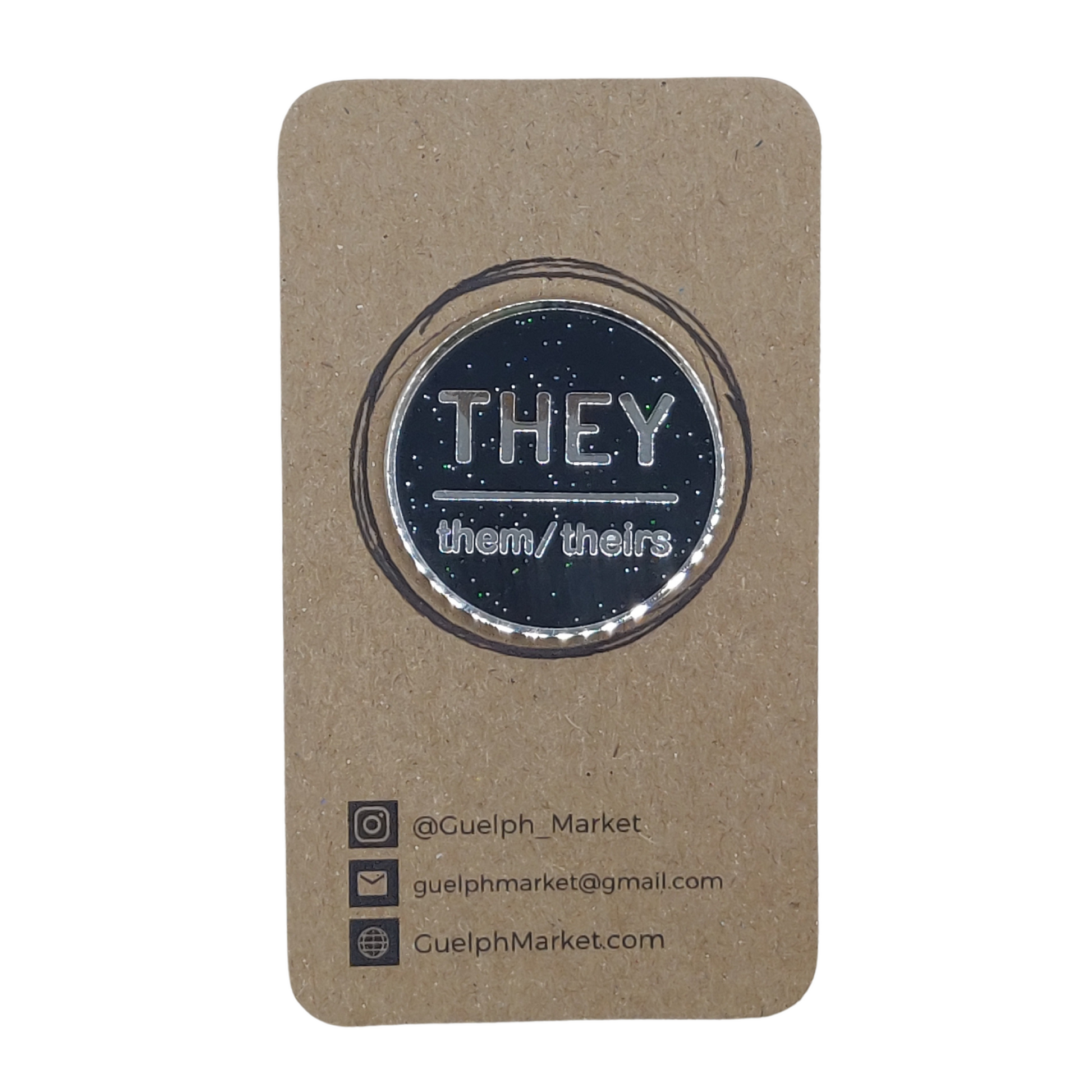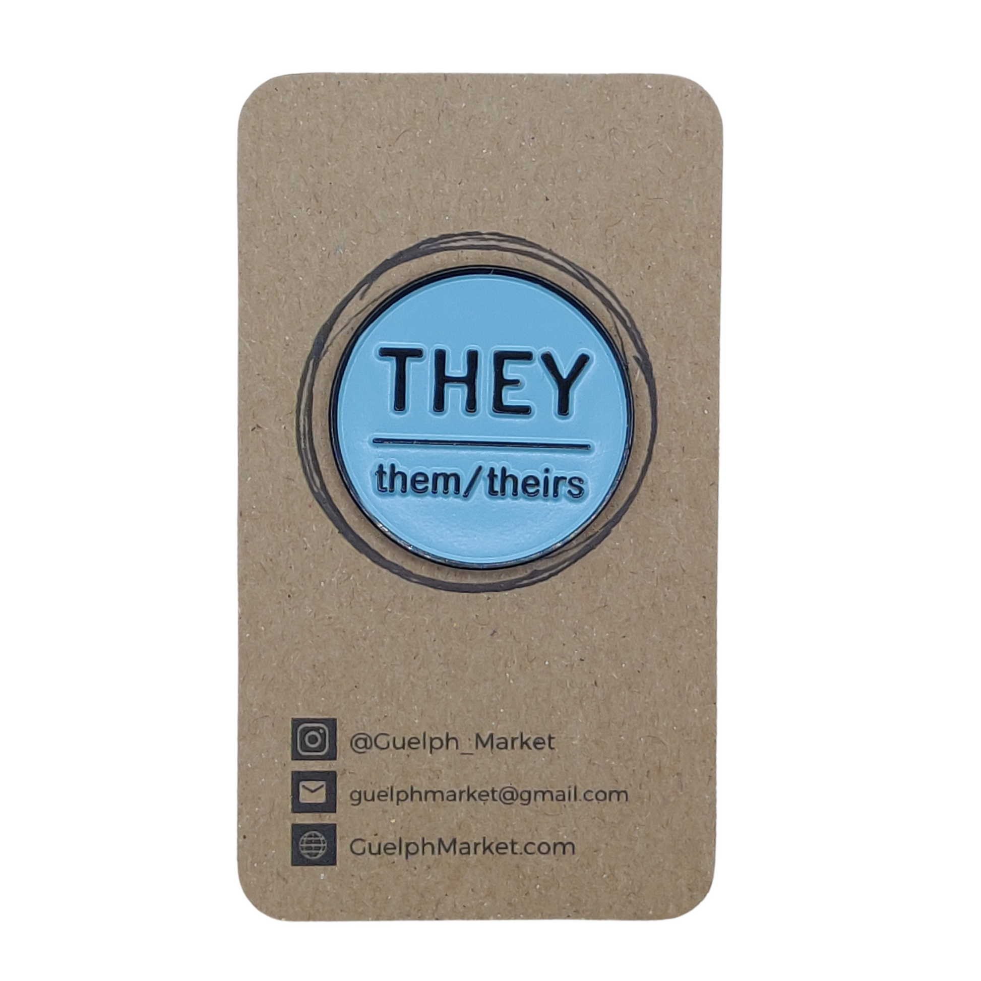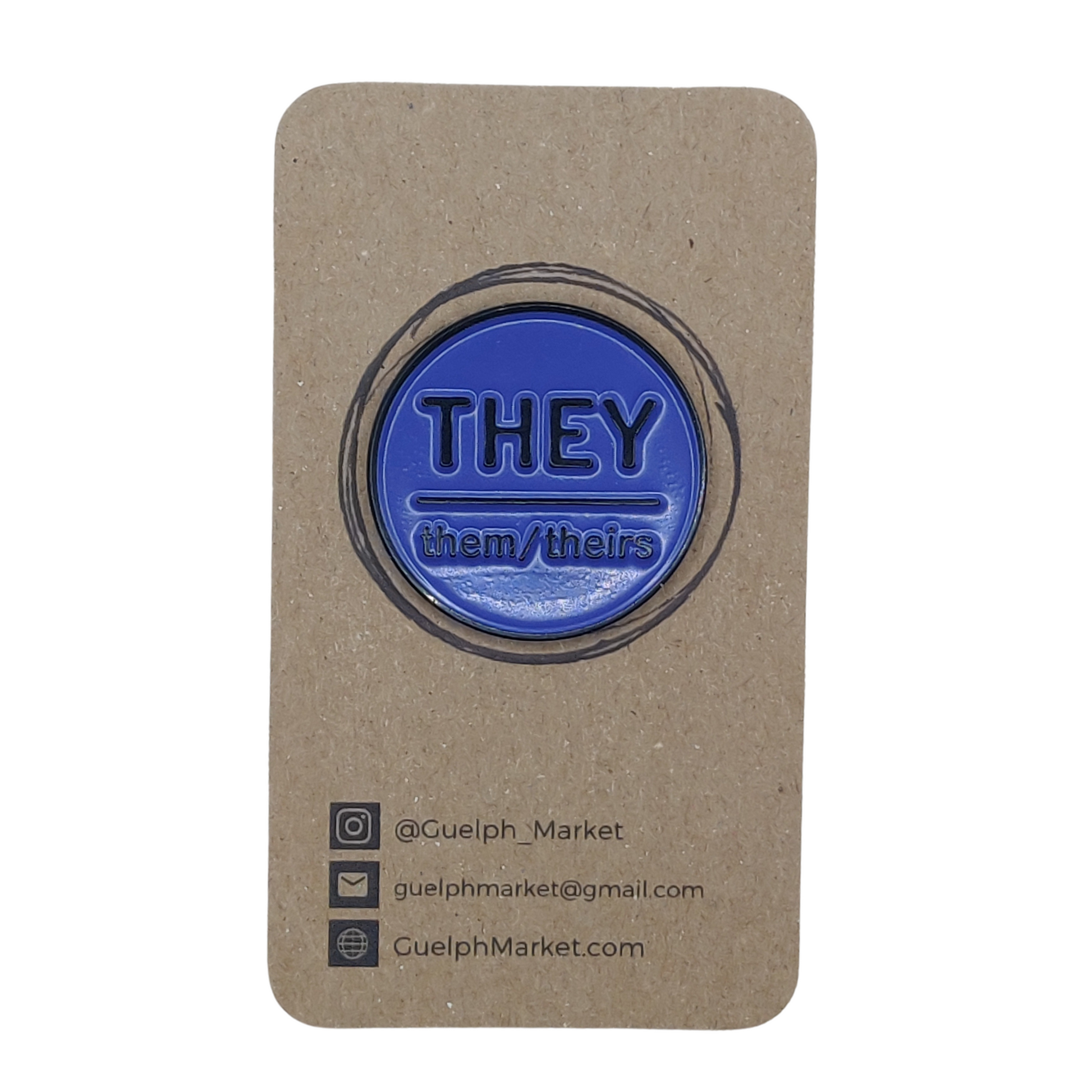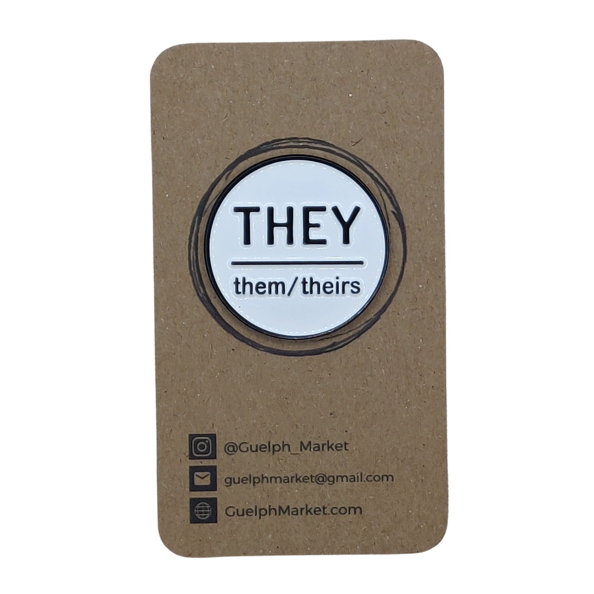 Circular pronoun pins with They, Them, Theirs on it.