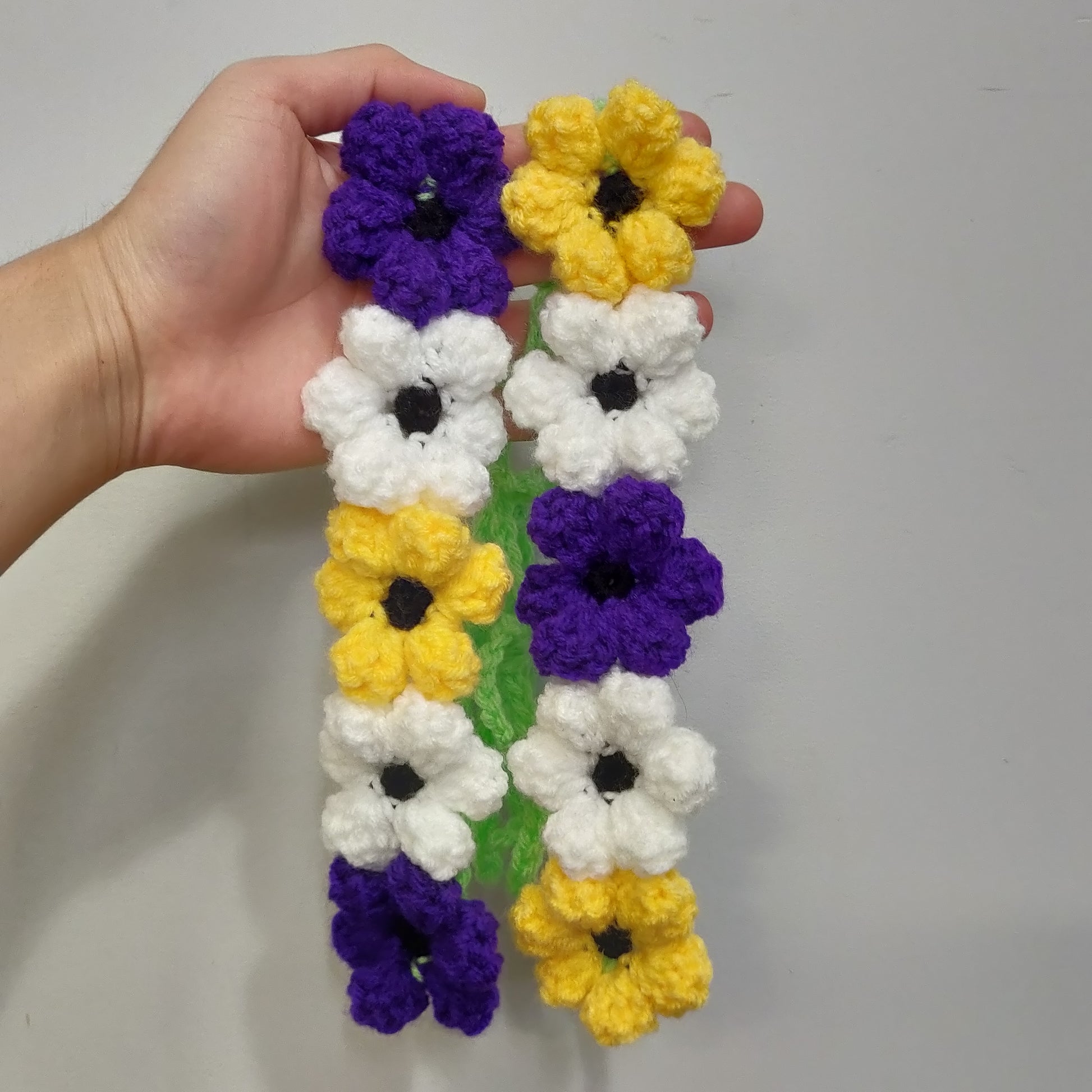 Crochet Floral Headband #36 is made with five handmade crochet flowers in Purple, Yellow and White.