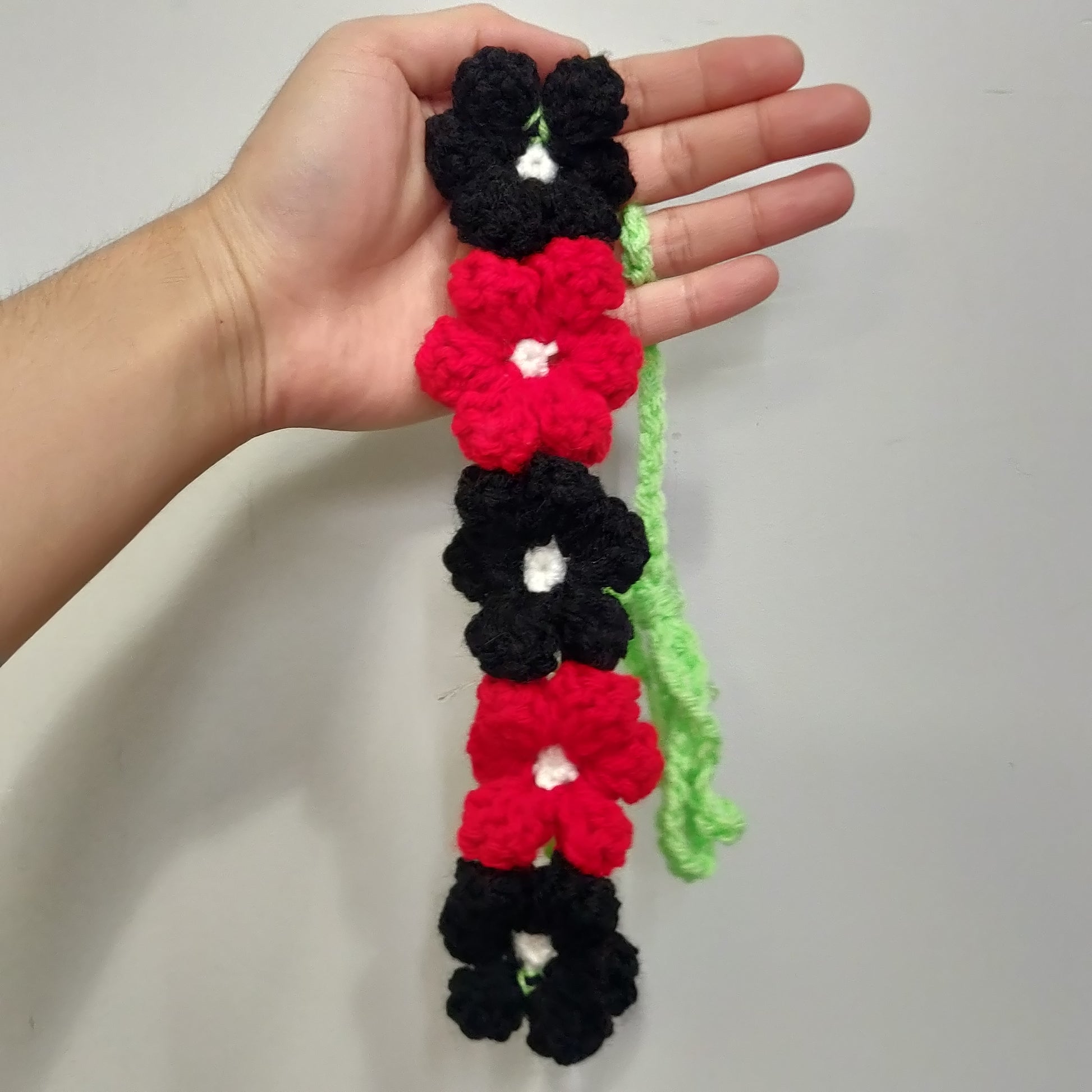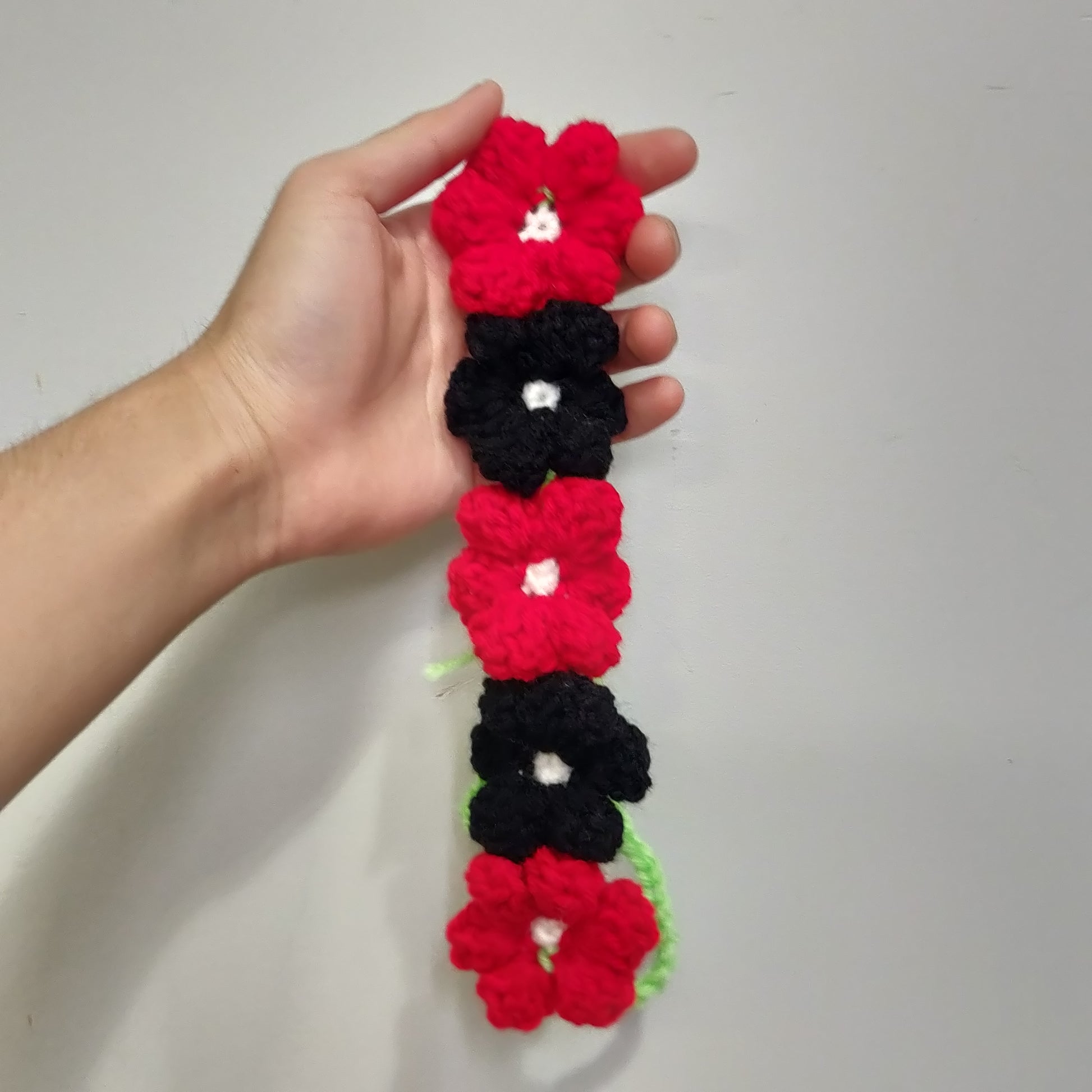 Crochet Floral Headband #42 is made with five handmade crochet flowers in Black and Red.
